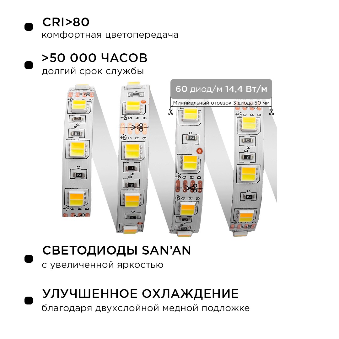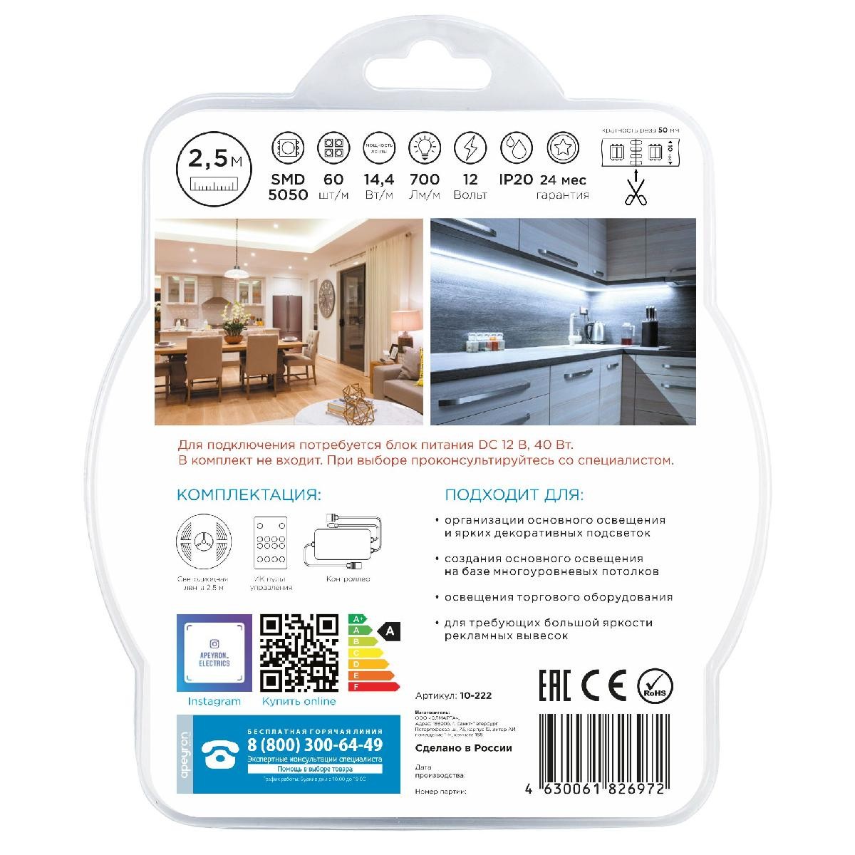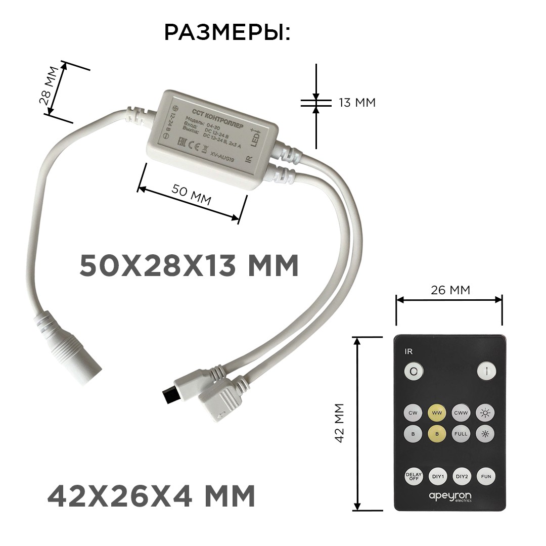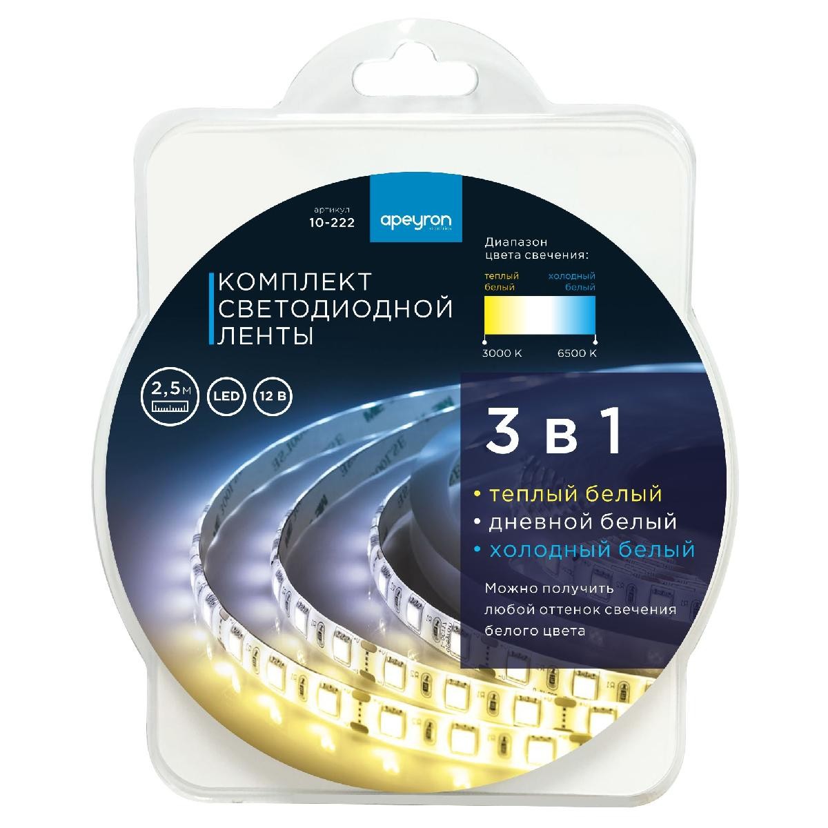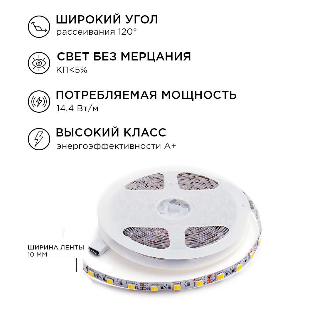 Комплект светодиодной ленты Apeyron 12В 14,4Вт/м smd5050 60д/м IP20 700Лм/м 2,5м 3000К+6500К (коннектор, контроллер) 10-222✖Добавить к сравнениюПерейти к сравнению