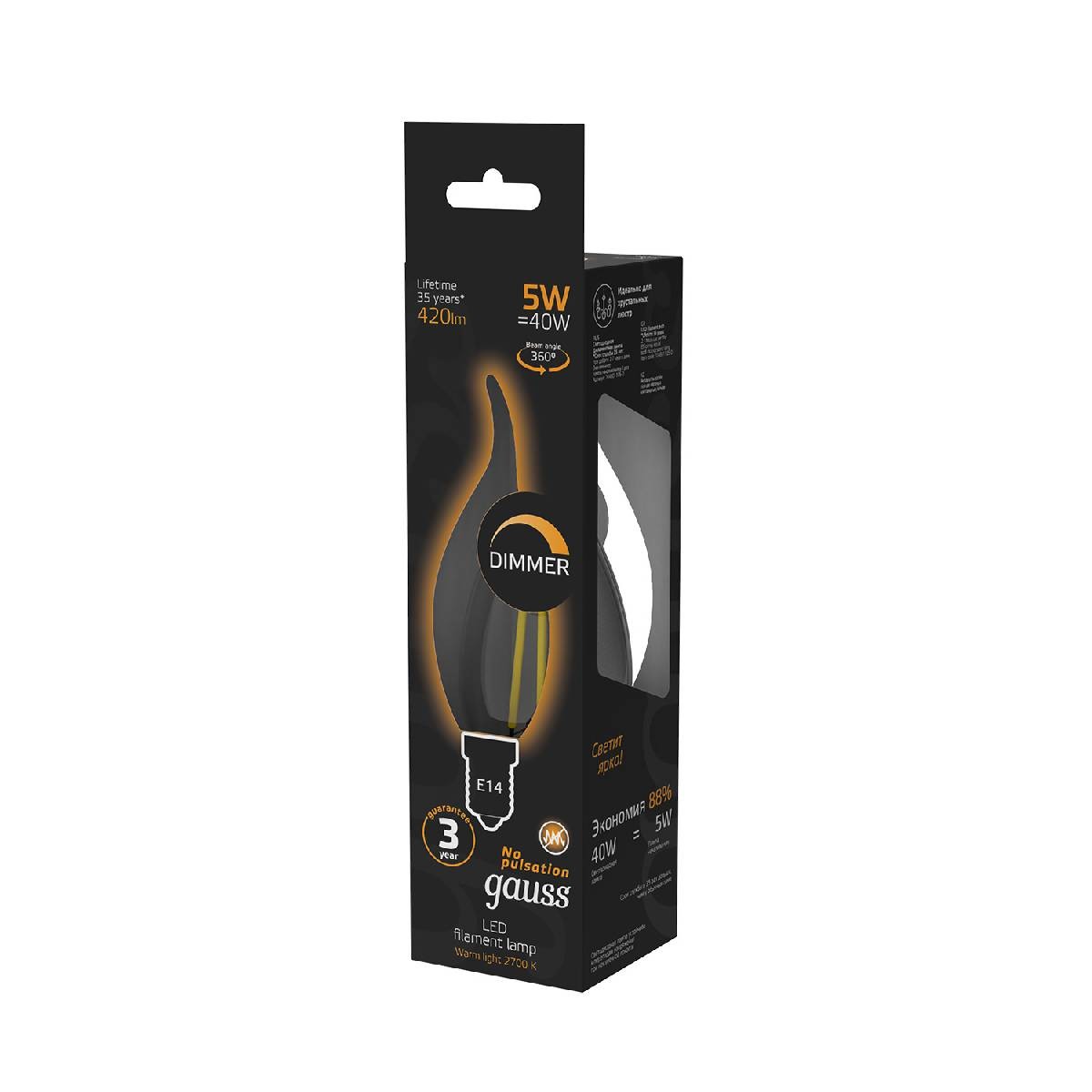 Лампа светодиодная диммируемая Gauss филаментная E14 5W 2700К прозрачная 104801105-D✖Добавить к сравнениюПерейти к сравнению