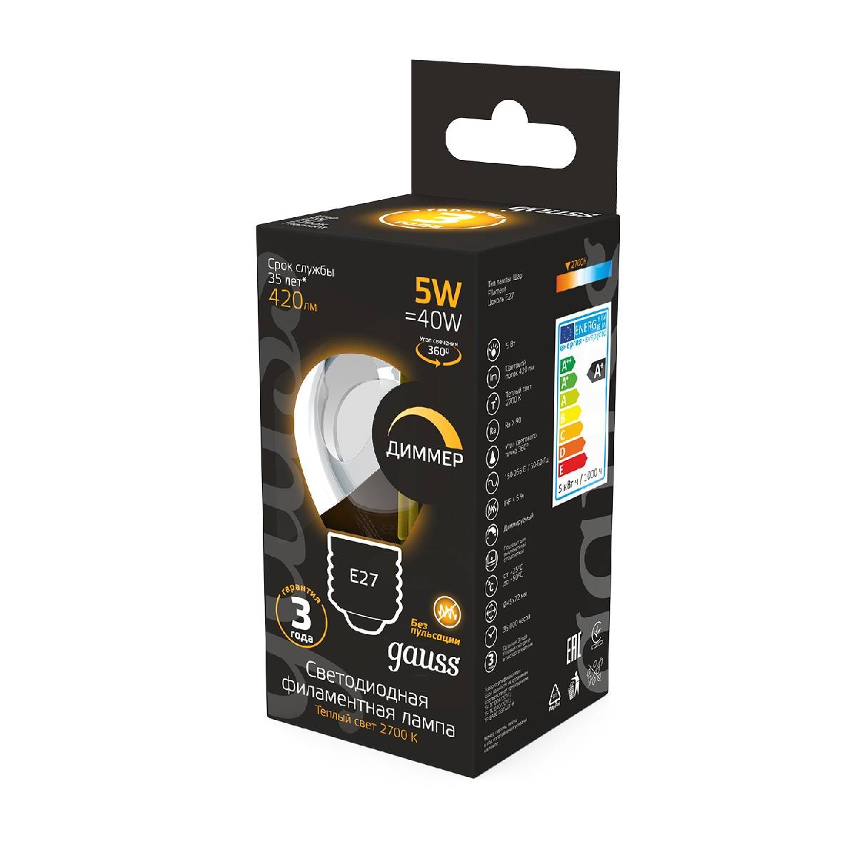 Лампа светодиодная диммируемая Gauss филаментная E27 5W 2700К прозрачная 105802105-D✖Добавить к сравнениюПерейти к сравнению
