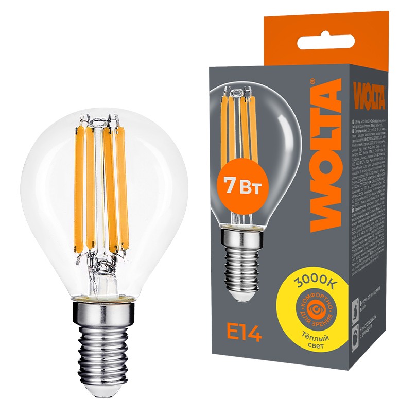 Лампа светодиодная филаментная WOLTA 7Вт 3000K Е14 шар прозрачный WF-G45-7W3KE14✖Добавить к сравнениюПерейти к сравнению