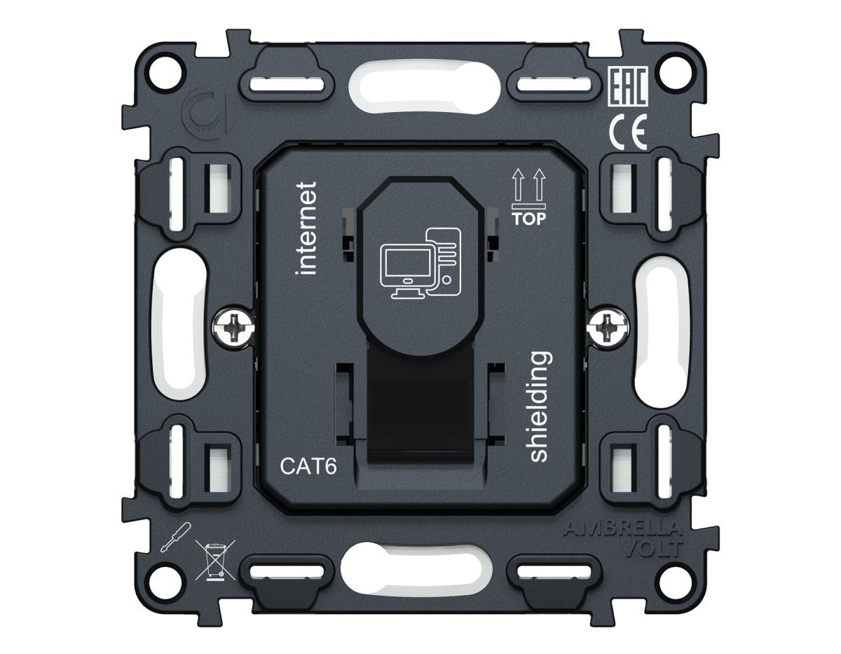 Механизм компьютерной розетки RJ-45 (8P8C) CAT6A экранированной с автоматической защитной шторкой QUANT Ambrella Volt VM185✖Добавить к сравнениюПерейти к сравнению