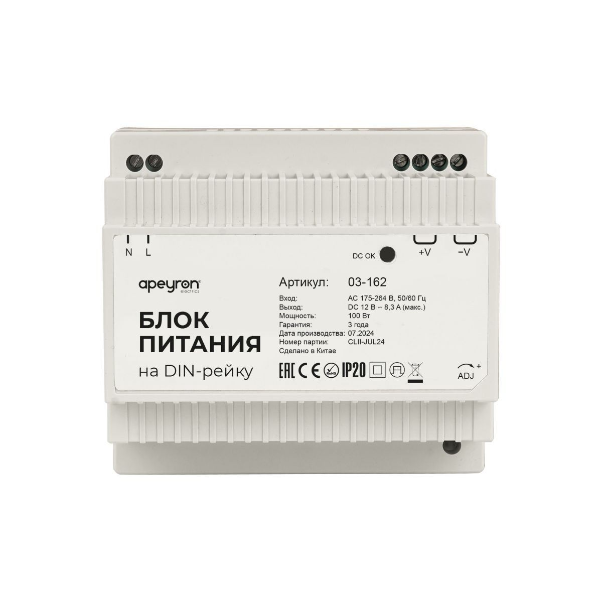 Блок питания на DIN рейку Apeyron 12В, 100Вт, 175-264В, 8,3А, IP20 03-162✖Добавить к сравнениюПерейти к сравнению