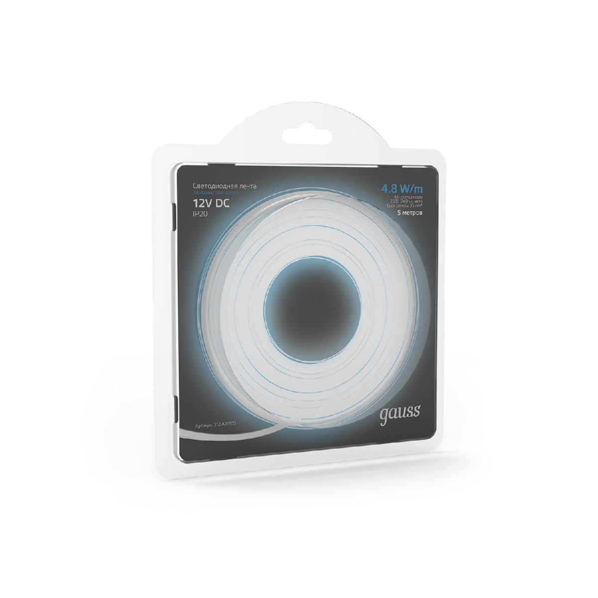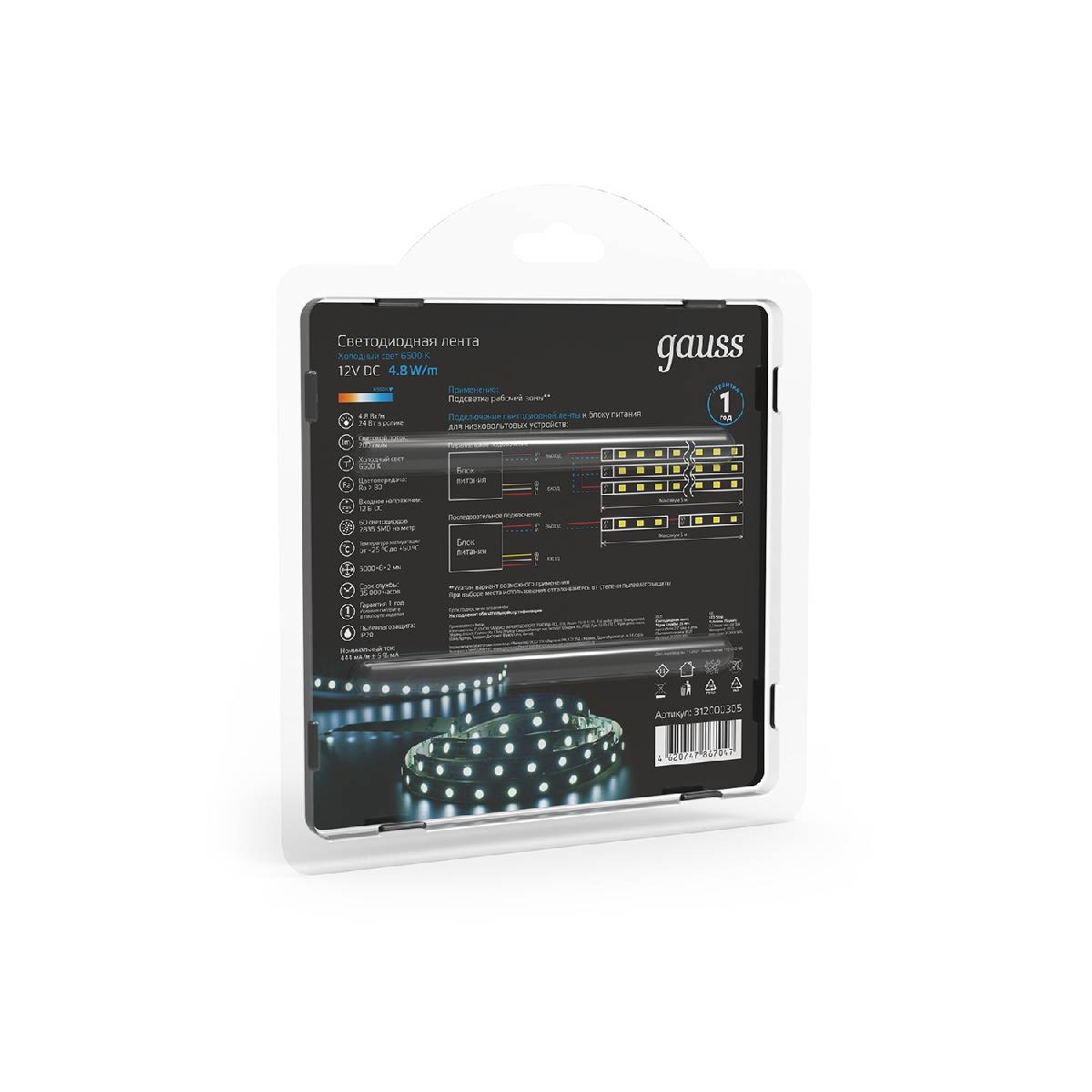 Светодиодная лента Gauss 4,8W/m 60LED/m 2835SMD холодный белый 5M 312000305✖Добавить к сравнениюПерейти к сравнению